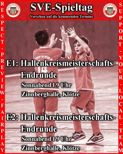 Die Vorschau auf das kommende Wochenende des SV Eintracht Salzwedel 09. Aufgrund der Witterung und der Nicht-Bespielbarkeit der Plätze mussten einige Partien abgesagt werden. Wir wünschen unseren beiden E-Jugend-Mannschaften maximalen Erfolg bei der Hallenkreismeisterschafts-Endrunde.
